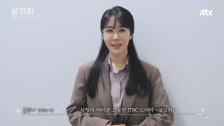 안녕하세요 설강화에서 강청야 역할을 맡은 유인나 입니다 첫 촬영즘에 눈이 많이 내리던 내관령에서 촬영을 했던 게 기억이 생생한데요 벌써 두 번의 계절을 보내 뭐 마지막 촬영을 했어요 이번 작품을 통해서 정말 새로운 모습을 보여드리고 싶었는데 어떻게 보셨을지 너무 궁금 하네요 저는 정말 최선을 다해서 열심히 즐겁게 촬영을 했구요 많은 분들께서 저의 작품 보고 즐거운 시간 보내셨으면 좋겠어요 저는 그동안 다른 작품에서는 주로 한 배우분과 호흡을 맞춰었던 것 같은데 이번 작품에서는 굉장히 많은 분들과 골고루 호흡을 맞춰 봤어요 다 너무너무 멋져고 프로페셔널 했고 너무 다정했고 그래서 정말 즐거운 기억이었구요 특히 감독님 정말 존경합니다 진심으로 존경하게 됐구요 시청자 여러분 그동안 jtbc 드라마 설강화 사랑해 주셔서 진심으로 감사드립니다 저는 또 좋은 모습으로 인사 드릴께요 감사합니다